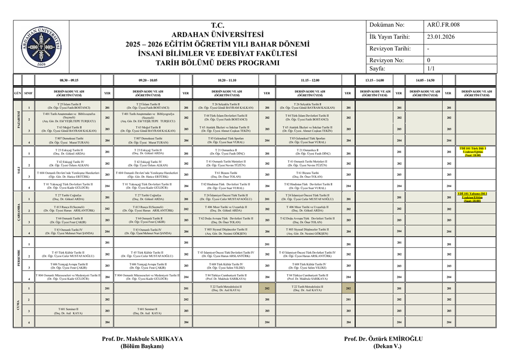 (Güncellendi) Tarih Bölümü 2025-2026 Eğitim-Öğretim Yılı Bahar Yarıyılı Haftalık Ders Program