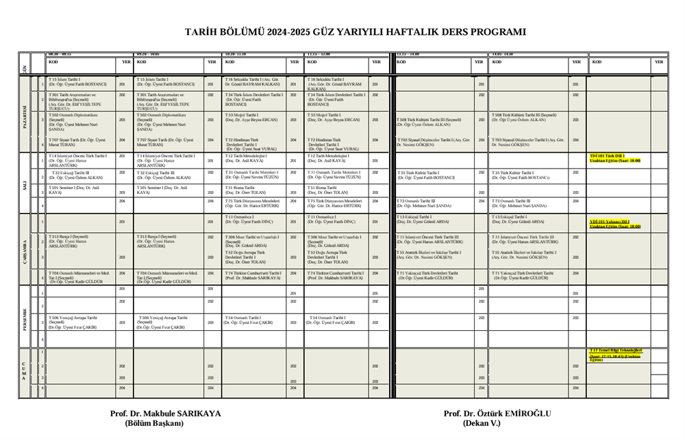 (Güncellendi) Tarih Bölümü 2025-2026 Eğitim-Öğretim Yılı Güz Yarıyılı Haftalık Ders Program