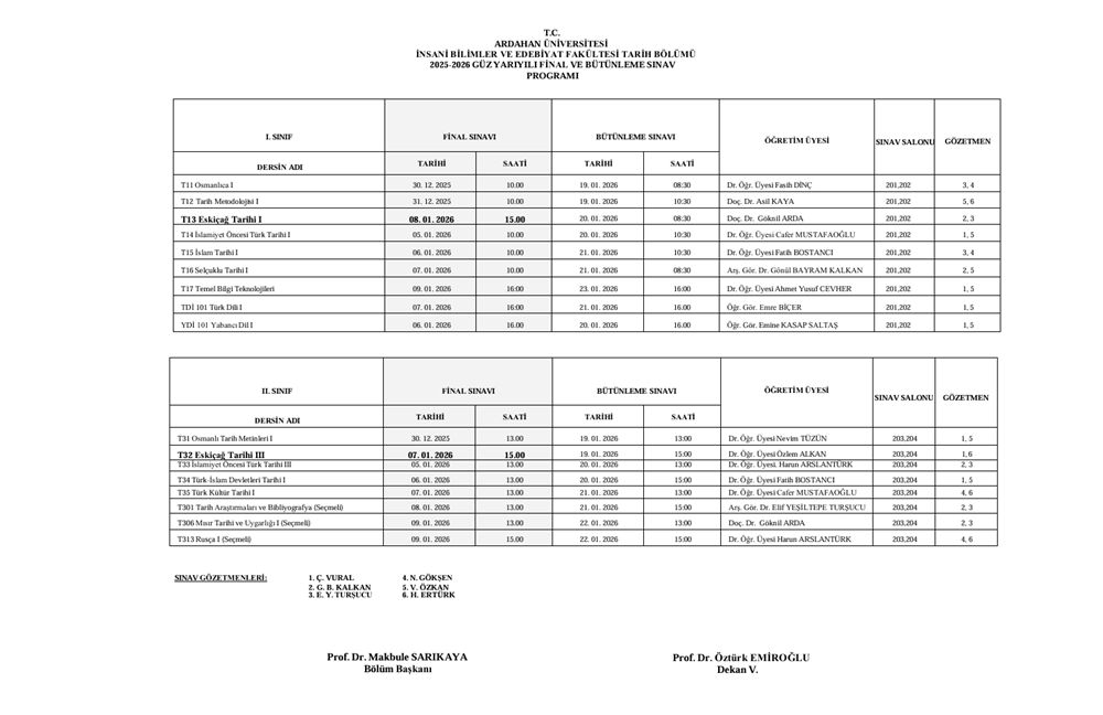 (Güncellendi) Tarih Bölümü 2025-2026 Güz Yarıyılı Final ve Bütünleme Sınav Programı