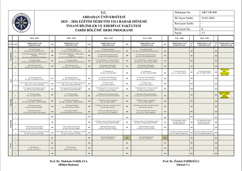 (Güncellendi) Tarih Bölümü 2025-2026 Eğitim-Öğretim Yılı Bahar Yarıyılı Haftalık Ders Program