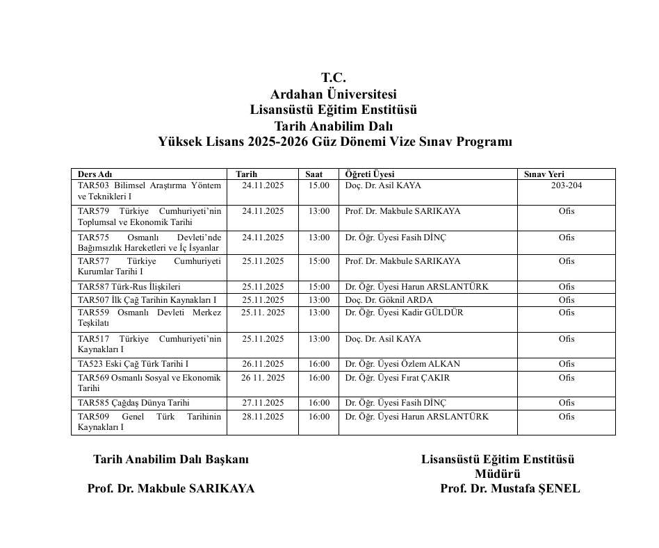 Tarih Bölümü 2025-2026 Güz Yarıyılı LİSANSÜSTÜ Vize Sınav Programı